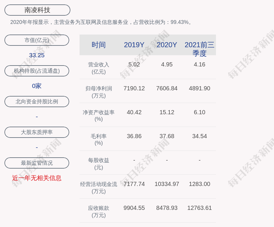 2020年年报显示,南凌科技的主营业务为互联网及信息服务业,占营收比例为:99.43%。