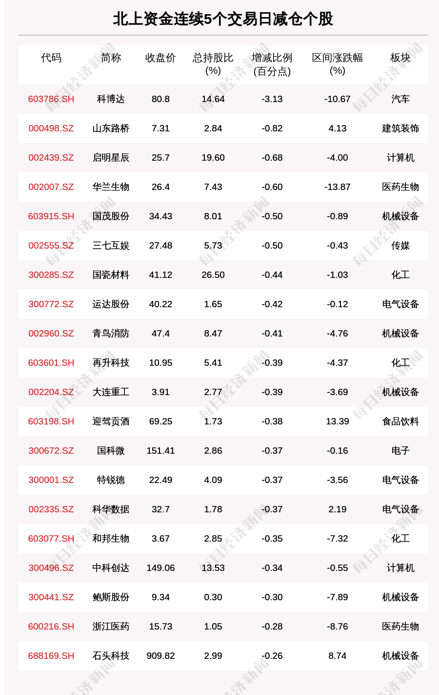 每经AI快讯,1月21日,北上资金连续5个交易日卖出58个股。北上资金连续5个交易日减仓个股中,科博达(603786.SH,收盘价:80.8元)减持比例增幅最大,5个交易日减持3.13百分点,其他跌幅较大的个股包括山东路桥(000498.SZ,收盘价:7.31元)、启明星辰(002439.SZ,收盘价:25.7元)、华兰生物(002007.SZ,收盘价:26.4元),分别减持0.82个百分点、0.68个百分点、0.60个百分点。