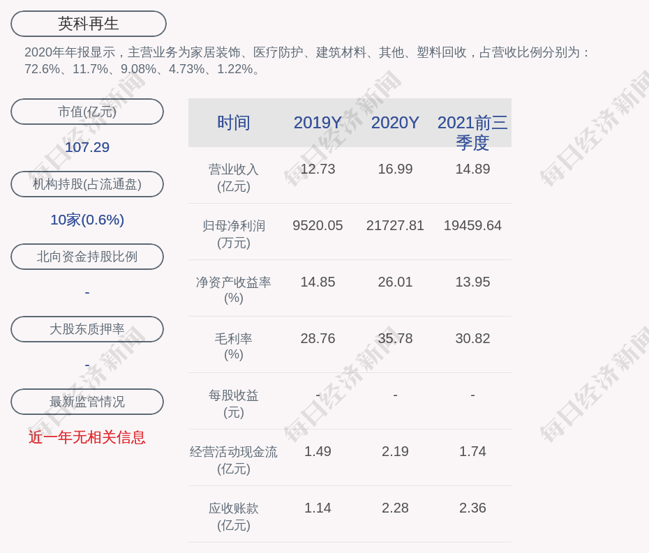 2020年年报显示,英科再生的主营业务为家居装饰、医疗防护、建筑材料、其他、塑料回收,占营收比例分别为:72.6%、11.7%、9.08%、4.73%、1.22%。