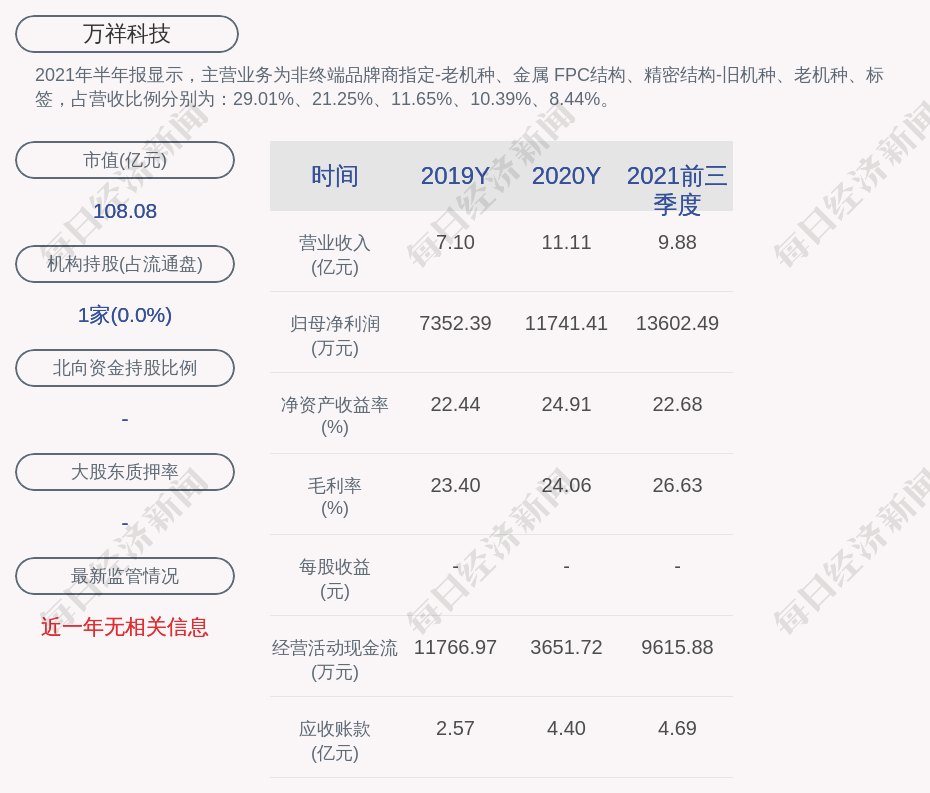 2021年半年报显示,万祥科技的主营业务为非终端品牌商指定-老机种、金属+FPC结构、精密结构-旧机种、老机种、标签,占营收比例分别为:29.01%、21.25%、11.65%、10.39%、8.44%。