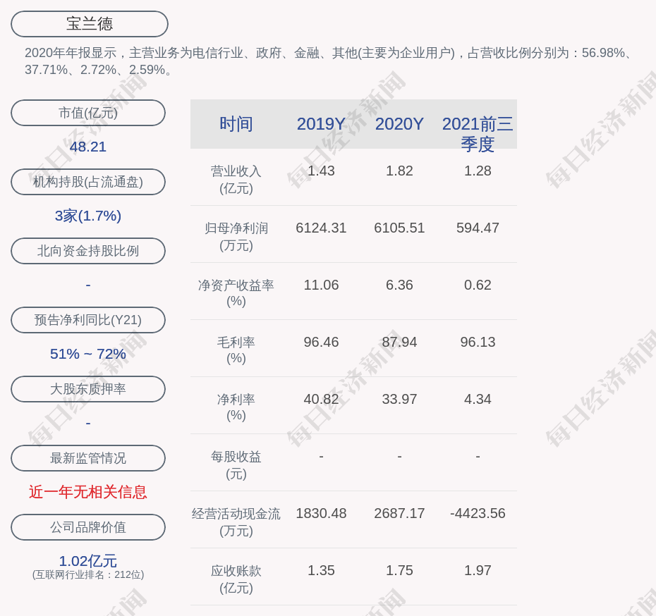 2020年年报显示,宝兰德的主营业务为电信行业、政府、金融、其他(主要为企业用户),占营收比例分别为:56.98%、37.71%、2.72%、2.59%。