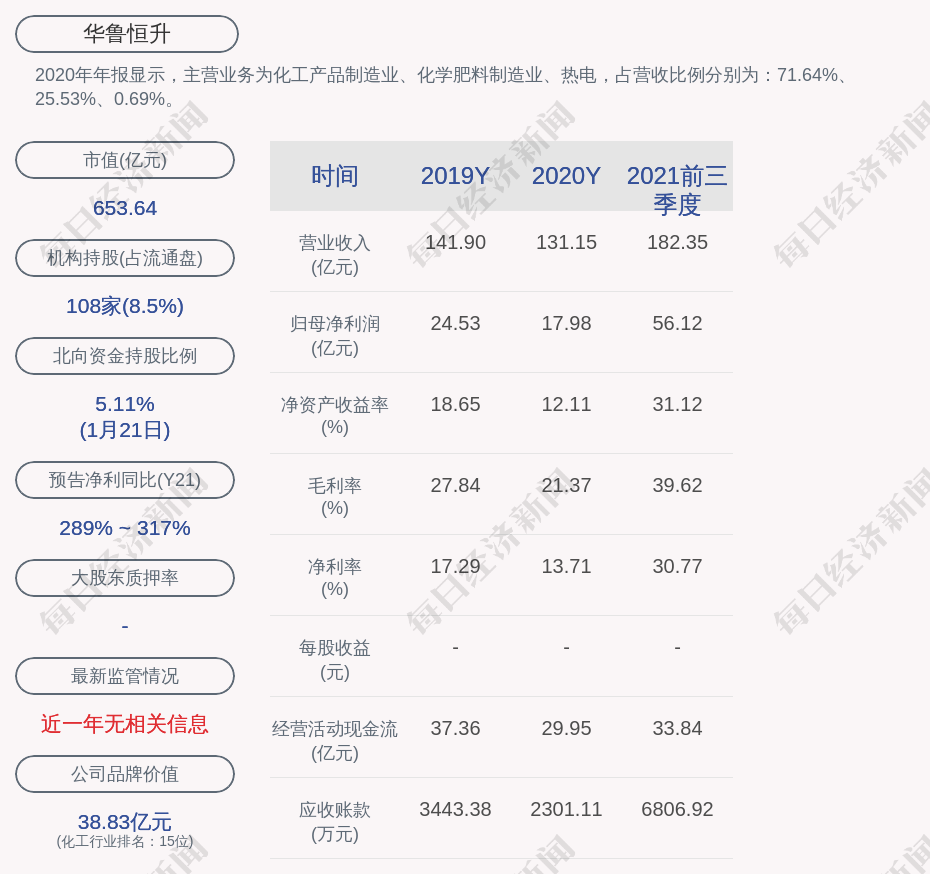 2020年年报显示,华鲁恒升的主营业务为化工产品制造业、化学肥料制造业、热电,占营收比例分别为:71.64%、25.53%、0.69%。