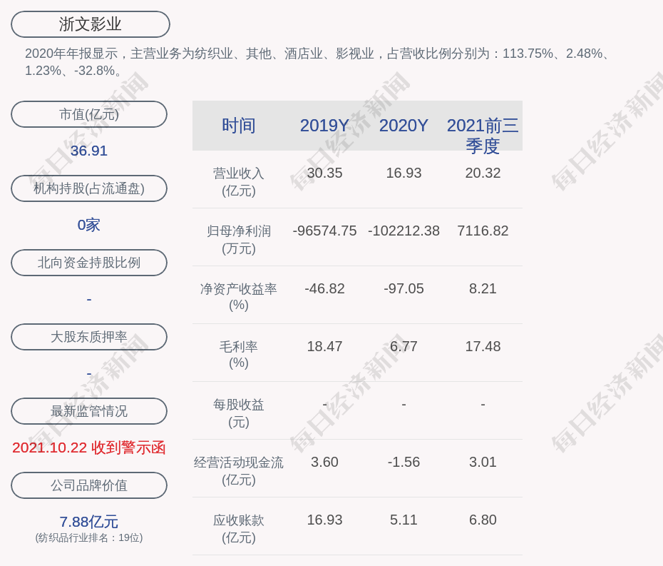 2020年年报显示,浙文影业的主营业务为纺织业、其他、酒店业、影视业,占营收比例分别为:113.75%、2.48%、1.23%、-32.8%。