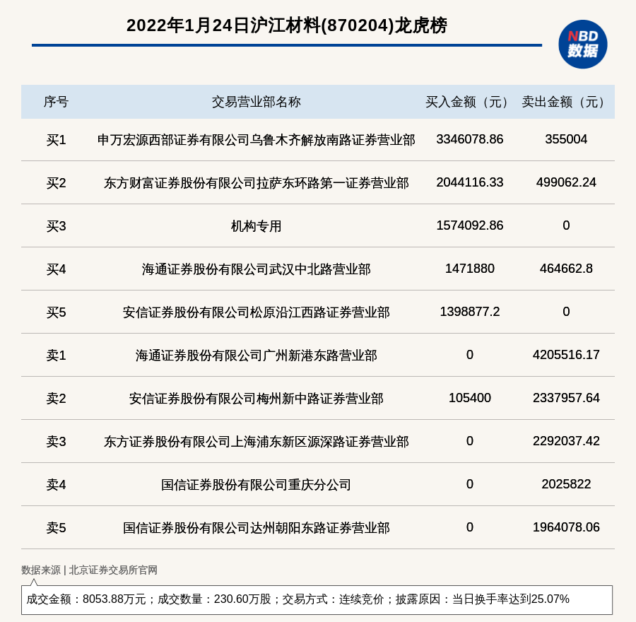 每经讯,2022年1月24日,北交所上市公司沪江材料(870204)登上龙虎榜,交易方式是连续竞价,披露原因是当日换手率达到25.07%,成交数量230.60万股,成交金额8053.88万元。买一席位为申万宏源西部证券有限公司乌鲁木齐解放南路证券营业部,买入334.61万元;卖一席位为海通证券股份有限公司广州新港东路营业部,卖出420.55万元。