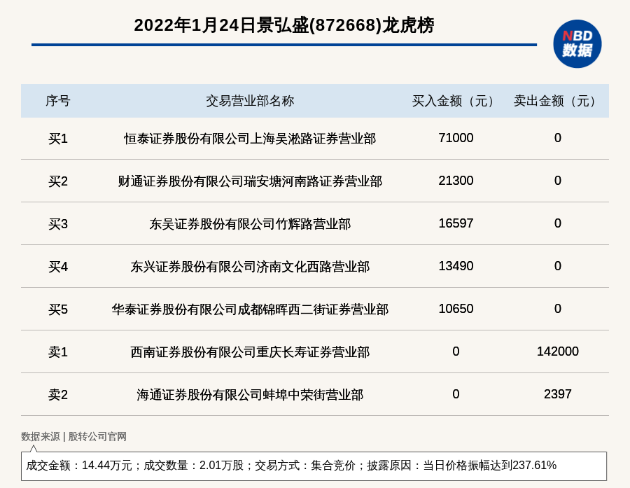 每经讯,2022年1月24日,新三板创新层公司景弘盛(872668)登上龙虎榜,交易方式是集合竞价,披露原因是当日价格振幅达到237.61%,成交数量2.01万股,成交金额14.44万元。买一席位为恒泰证券股份有限公司上海吴淞路证券营业部,买入7.10万元;卖一席位为西南证券股份有限公司重庆长寿证券营业部,卖出14.20万元。