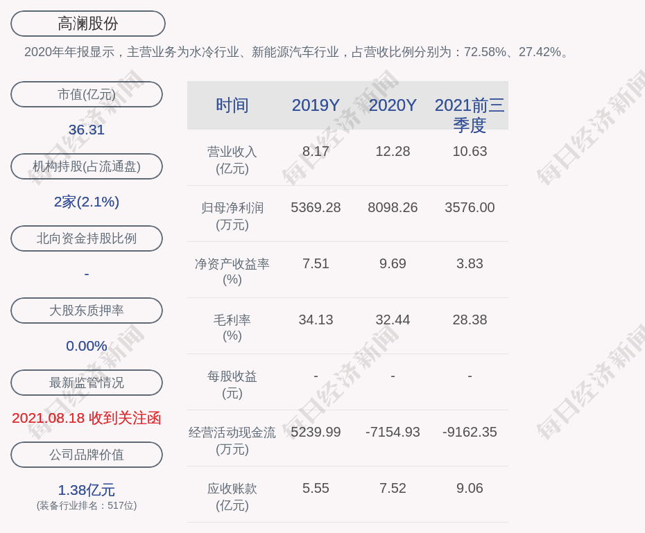 2020年年报显示,高澜股份的主营业务为水冷行业、新能源汽车行业,占营收比例分别为:72.58%、27.42%。