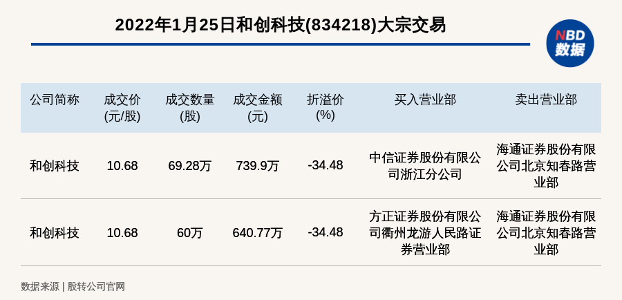每经讯,2022年1月25日,新三板创新层公司和创科技(834218)发生2笔大宗交易,总成交金额为1380.67万元,成交金额最高的一笔成交价10.68元/股,成交数量69.28万股,成交金额739.9万元,折价34.48%。买入营业部是中信证券股份有限公司浙江分公司,卖出营业部是海通证券股份有限公司北京知春路营业部。