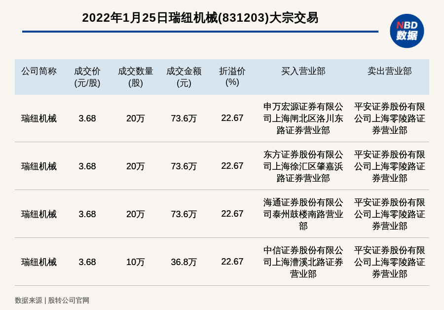 每经讯,2022年1月25日,新三板基础层公司瑞纽机械(831203)发生4笔大宗交易,总成交金额为257.6万元,其中一笔成交价3.68元/股,成交数量20万股,成交金额73.6万元,溢价22.67%。买入营业部是申万宏源证券有限公司上海闸北区洛川东路证券营业部,卖出营业部是平安证券股份有限公司上海零陵路证券营业部。