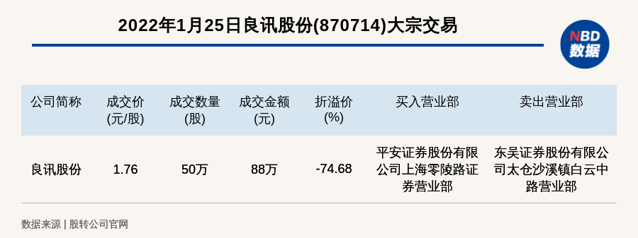 每经讯,2022年1月25日,新三板创新层公司良讯股份(870714)发生一笔大宗交易,成交价1.76元/股,成交数量50万股,成交金额88万元,折价74.68%。买入营业部是平安证券股份有限公司上海零陵路证券营业部,卖出营业部是东吴证券股份有限公司太仓沙溪镇白云中路营业部。