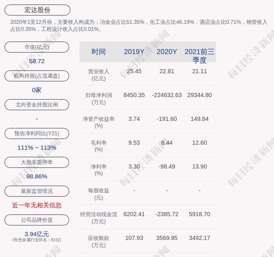 2020年1至12月份,宏达股份的主要收入构成为:冶金业占比51.35%,化工业占比46.19%,酒店业占比0.71%,物管收入占比0.35%,工程设计收入占比0.01%。