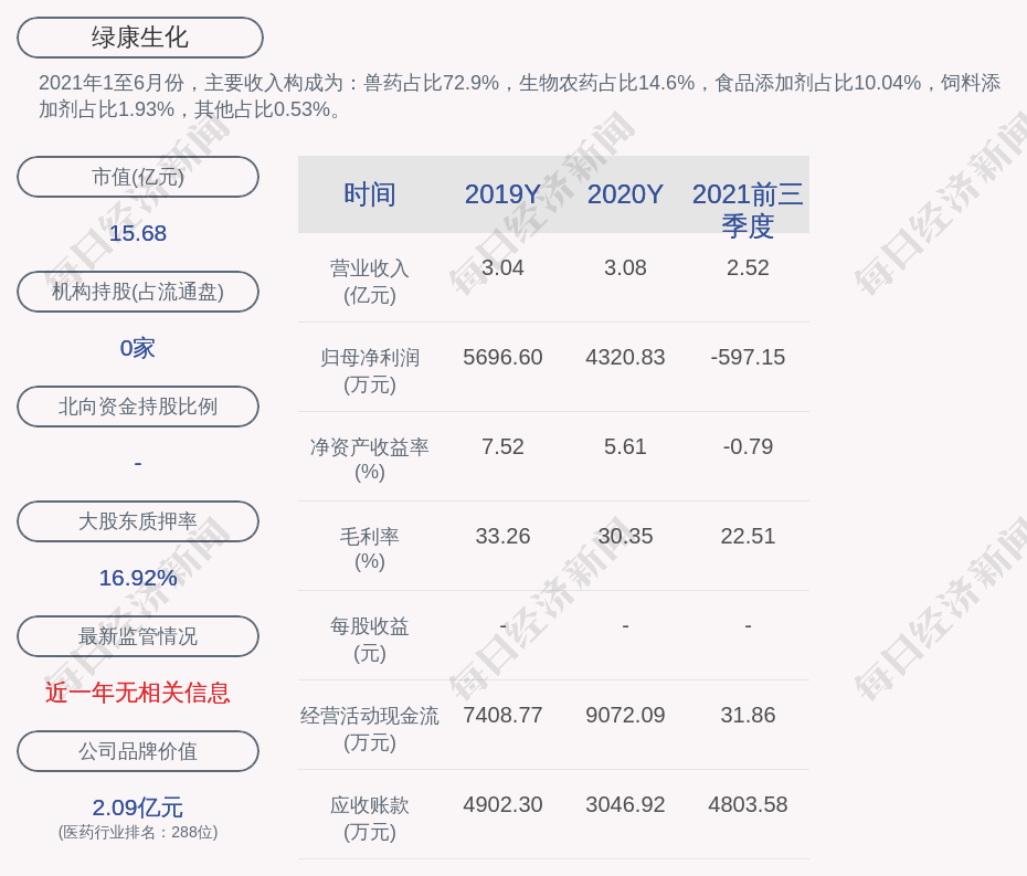 2021年1至6月份,绿康生化的主要收入构成为:兽药占比72.9%,生物农药占比14.6%,食品添加剂占比10.04%,饲料添加剂占比1.93%,其他占比0.53%。
