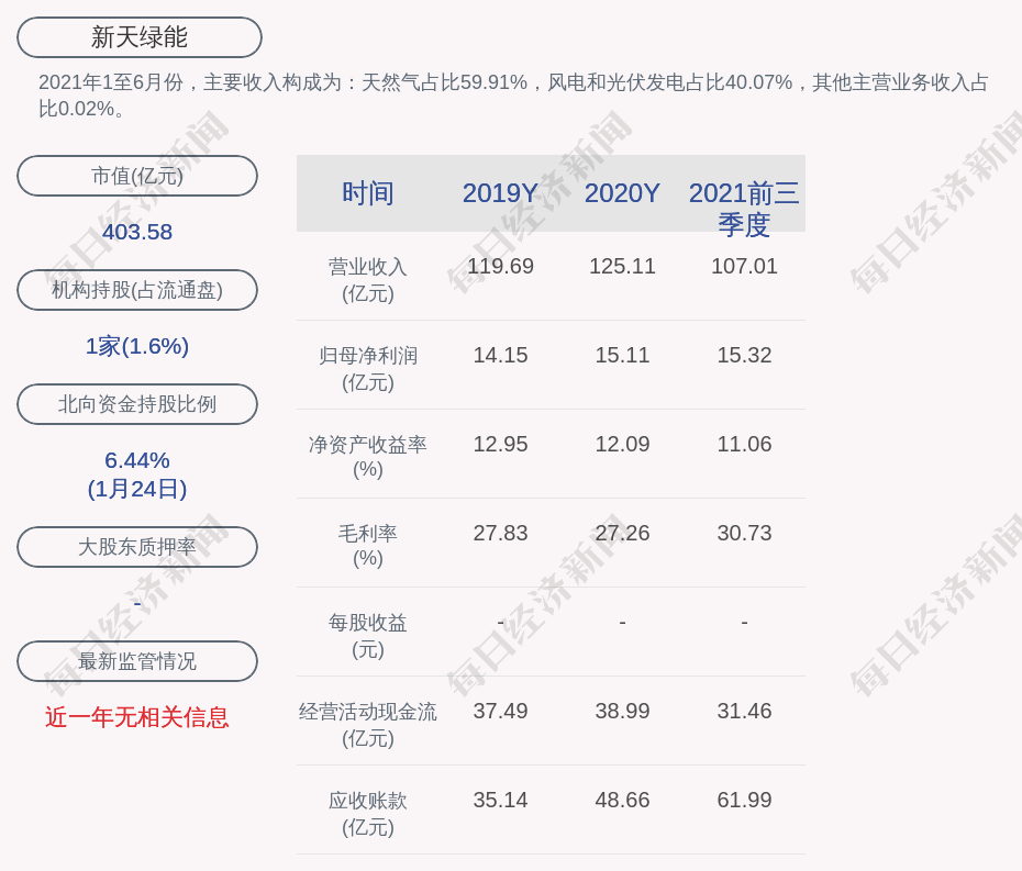 2021年1至6月份,新天绿能的主要收入构成为:天然气占比59.91%,风电和光伏发电占比40.07%,其他主营业务收入占比0.02%。