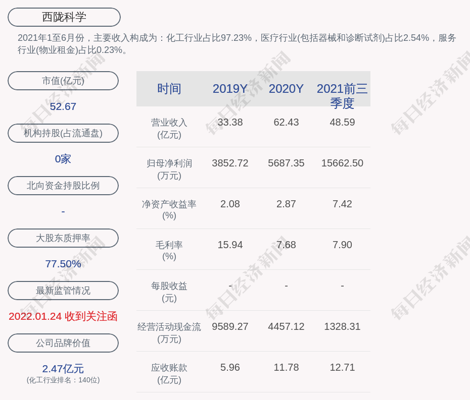 2021年1至6月份,西陇科学的主要收入构成为:化工行业占比97.23%,医疗行业(包括器械和诊断试剂)占比2.54%,服务行业(物业租金)占比0.23%。