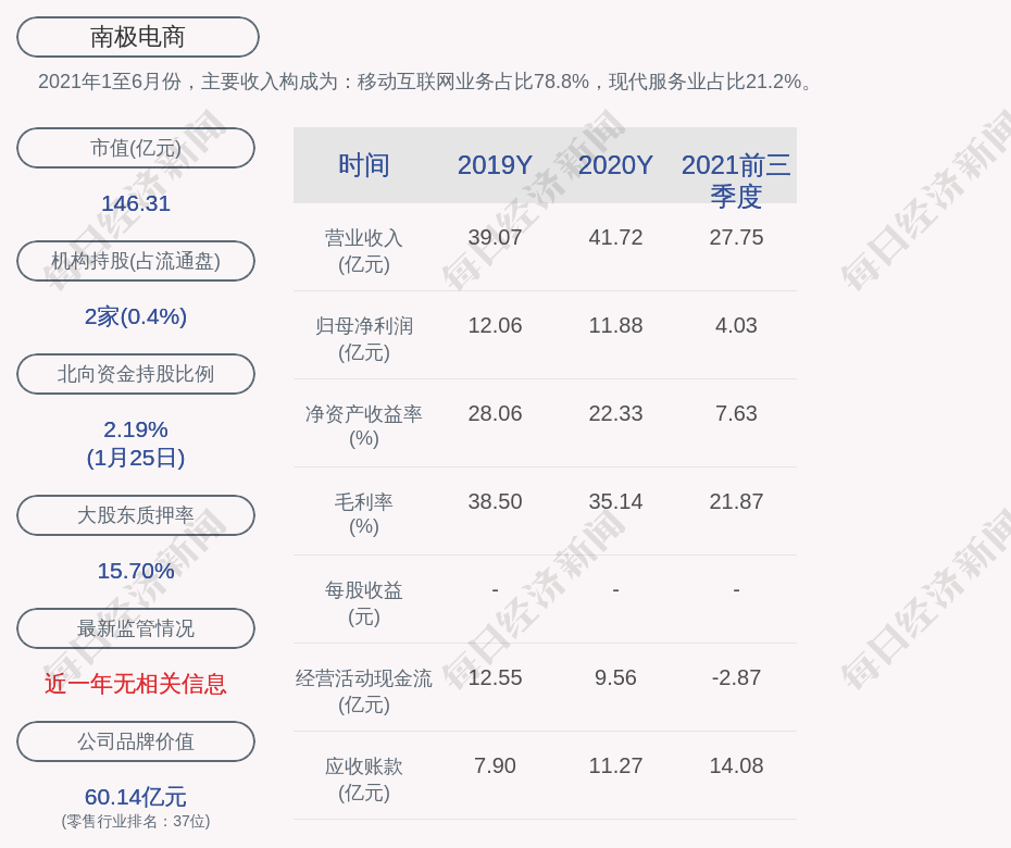 2021年1至6月份,南极电商的主要收入构成为:移动互联网业务占比78.8%,现代服务业占比21.2%。