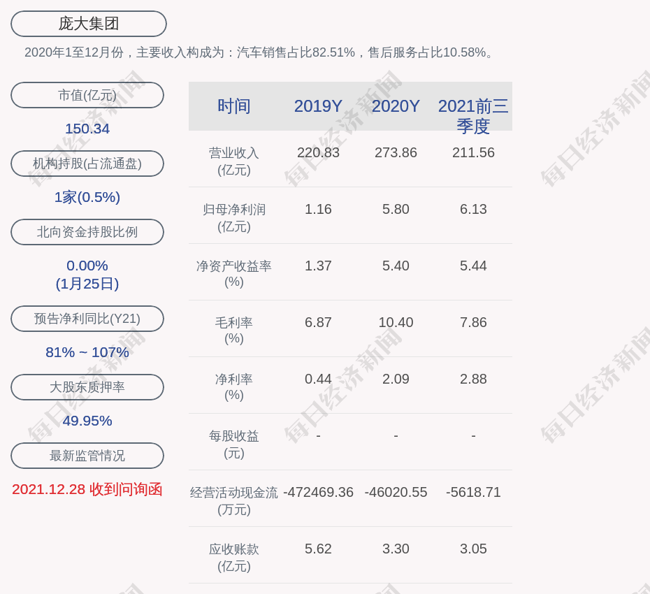 2020年1至12月份,庞大集团的主要收入构成为:汽车销售占比82.51%,售后服务占比10.58%。