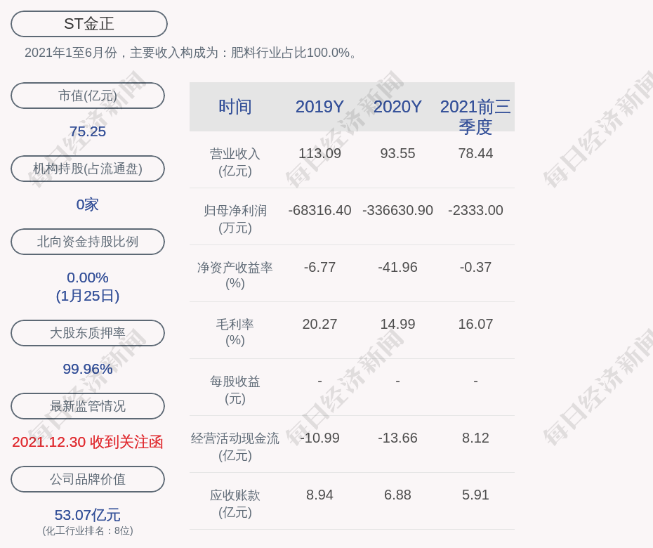 2021年1至6月份,ST金正的主要收入构成为:肥料行业占比100.0%。