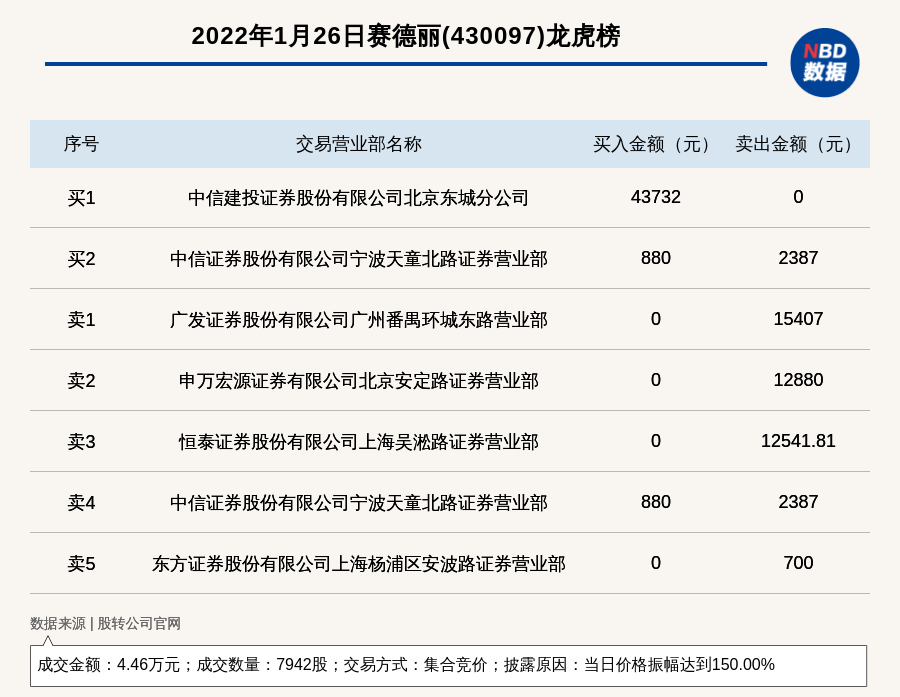 每经讯,2022年1月26日,新三板创新层公司赛德丽(430097)登上龙虎榜,交易方式是集合竞价,披露原因是当日价格振幅达到150.00%,成交数量7942股,成交金额4.46万元。买一席位为中信建投证券股份有限公司北京东城分公司,买入4.37万元;卖一席位为广发证券股份有限公司广州番禺环城东路营业部,卖出1.54万元。