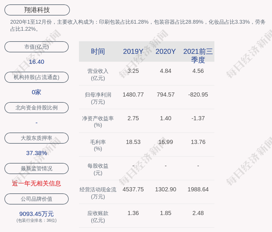 2020年1至12月份,翔港科技的主要收入构成为:印刷包装占比61.28%,包装容器占比28.89%,化妆品占比3.33%,劳务占比1.22%。
