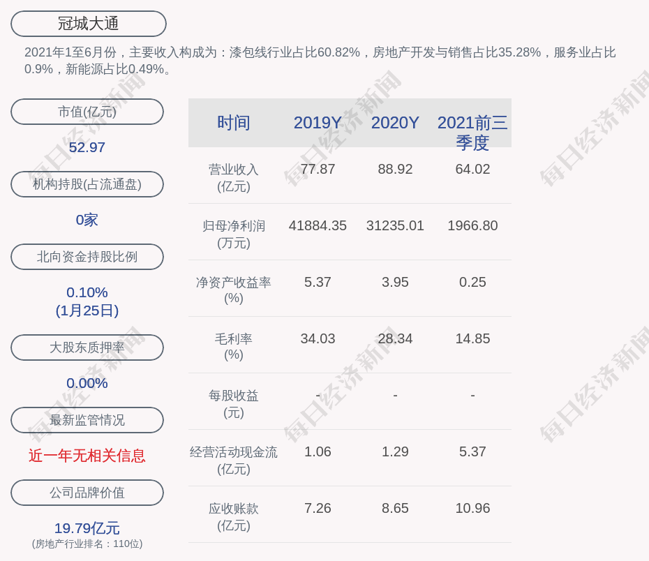 2021年1至6月份,冠城大通的主要收入构成为:漆包线行业占比60.82%,房地产开发与销售占比35.28%,服务业占比0.9%,新能源占比0.49%。
