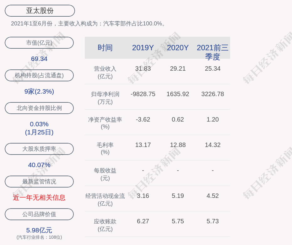 2021年1至6月份,亚太股份的主要收入构成为:汽车零部件占比100.0%。