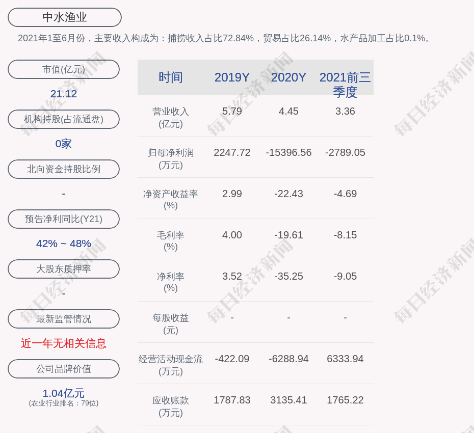 2021年1至6月份,中水渔业的主要收入构成为:捕捞收入占比72.84%,贸易占比26.14%,水产品加工占比0.1%。