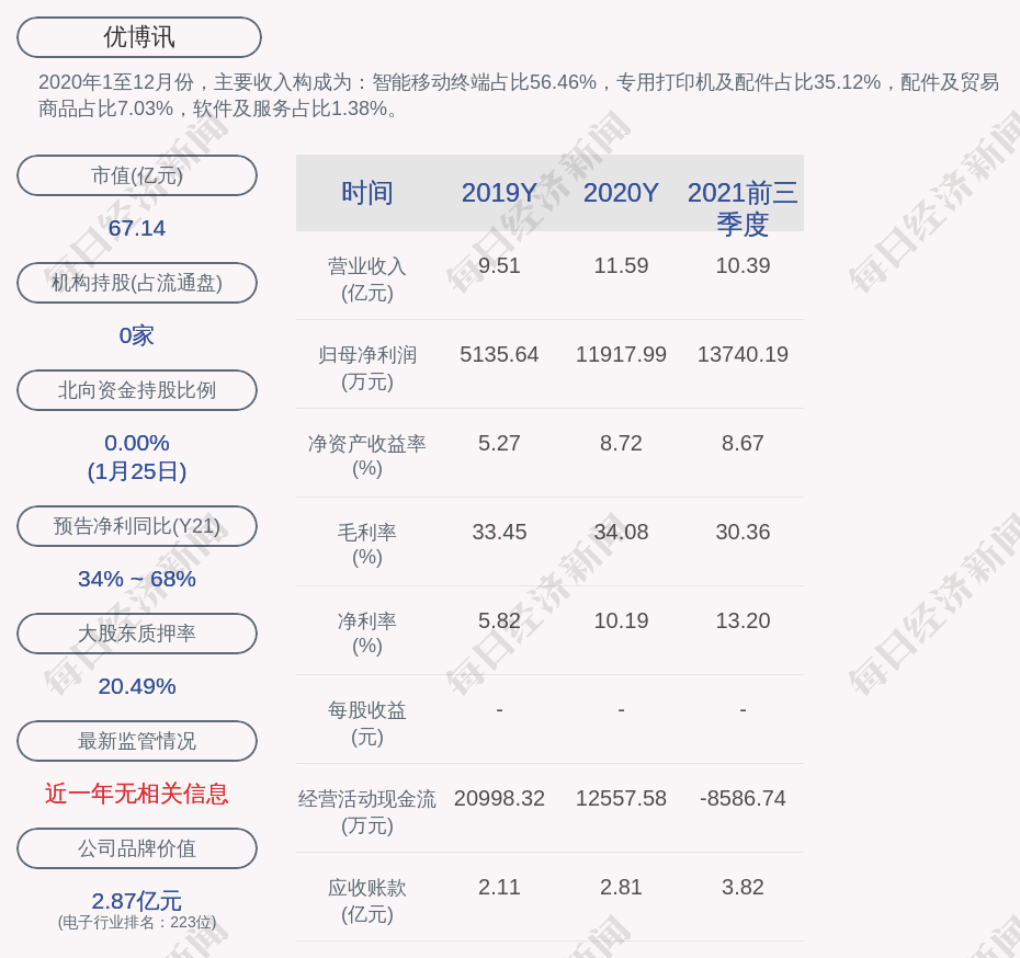 2020年1至12月份,优博讯的主要收入构成为:智能移动终端占比56.46%,专用打印机及配件占比35.12%,配件及贸易商品占比7.03%,软件及服务占比1.38%。