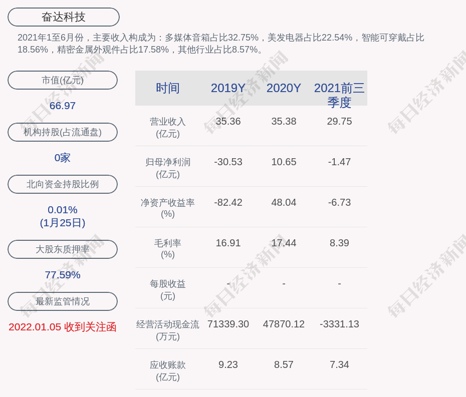 2021年1至6月份,奋达科技的主要收入构成为:多媒体音箱占比32.75%,美发电器占比22.54%,智能可穿戴占比18.56%,精密金属外观件占比17.58%,其他行业占比8.57%。