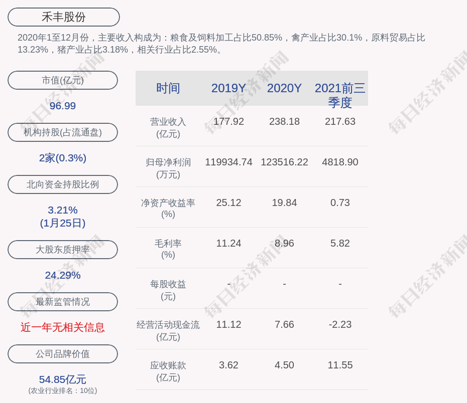 每经AI快讯,禾丰股份(SH 603609,收盘价:10.52元)1月26日晚间发布2021年度业绩快报,营业收入约293.64亿元,同比增加23.29%;归属于上市公司股东的净利润盈利约1.11亿元,同比减少91%;基本每股收益盈利0.12元,同比减少91.04%。公司2021年度营业收入同比增加23.29%,主要原因系:公司充分发挥饲料头部企业品牌与技术优势,持续加大市场开拓力度,饲料销量同比增长12.6%,销售均价亦同比有所上涨。公司2021年度归属于上市公司股东的净利润减少,主要原因系:国内生猪价格超预期下跌,叠加饲料成本上涨等因素,致使公司生猪养殖业务出现亏损。