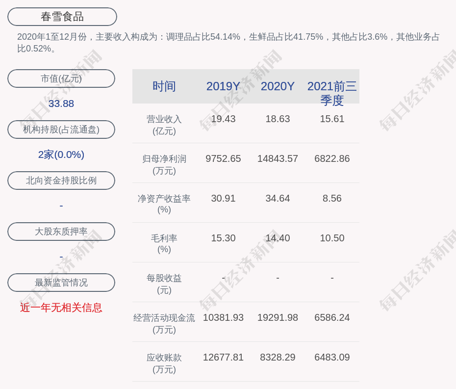 2020年1至12月份,春雪食品的主要收入构成为:调理品占比54.14%,生鲜品占比41.75%,其他占比3.6%,其他业务占比0.52%。