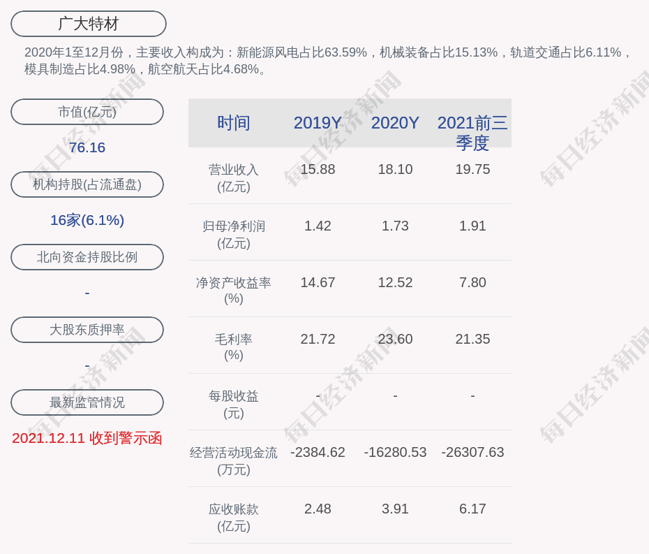 2020年1至12月份,广大特材的主要收入构成为:新能源风电占比63.59%,机械装备占比15.13%,轨道交通占比6.11%,模具制造占比4.98%,航空航天占比4.68%。