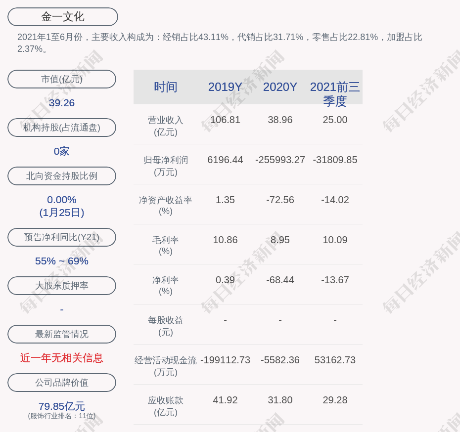 2021年1至6月份,金一文化的主要收入构成为:经销占比43.11%,代销占比31.71%,零售占比22.81%,加盟占比2.37%。
