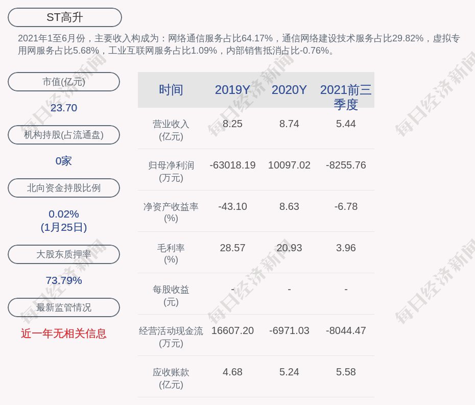 2021年1至6月份,ST高升的主要收入构成为:网络通信服务占比64.17%,通信网络建设技术服务占比29.82%,虚拟专用网服务占比5.68%,工业互联网服务占比1.09%,内部销售抵消占比-0.76%。