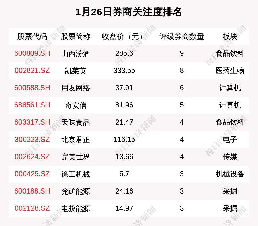 从券商对个股的关注程度来看,有22只个股获得多家券商关注,券商关注数量排名居前的个股是山西汾酒(600809.SH)、凯莱英(002821.SZ)、用友网络(600588.SH)。
