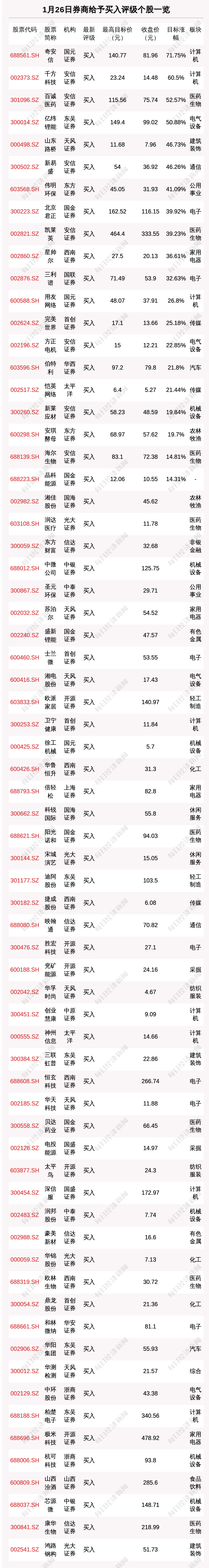 每经AI快讯,1月26日,券商给予评级的个股数共有94只,获得买入评级的个股数共有68只。在公布了目标价格的20只个股中,按照最新收盘价计算,预期涨幅排名居前的个股是奇安信(688561.SH)、千方科技(002373.SZ)、百诚医药(301096.SZ),预期涨幅分别是71.75%、60.5%、52.57%。