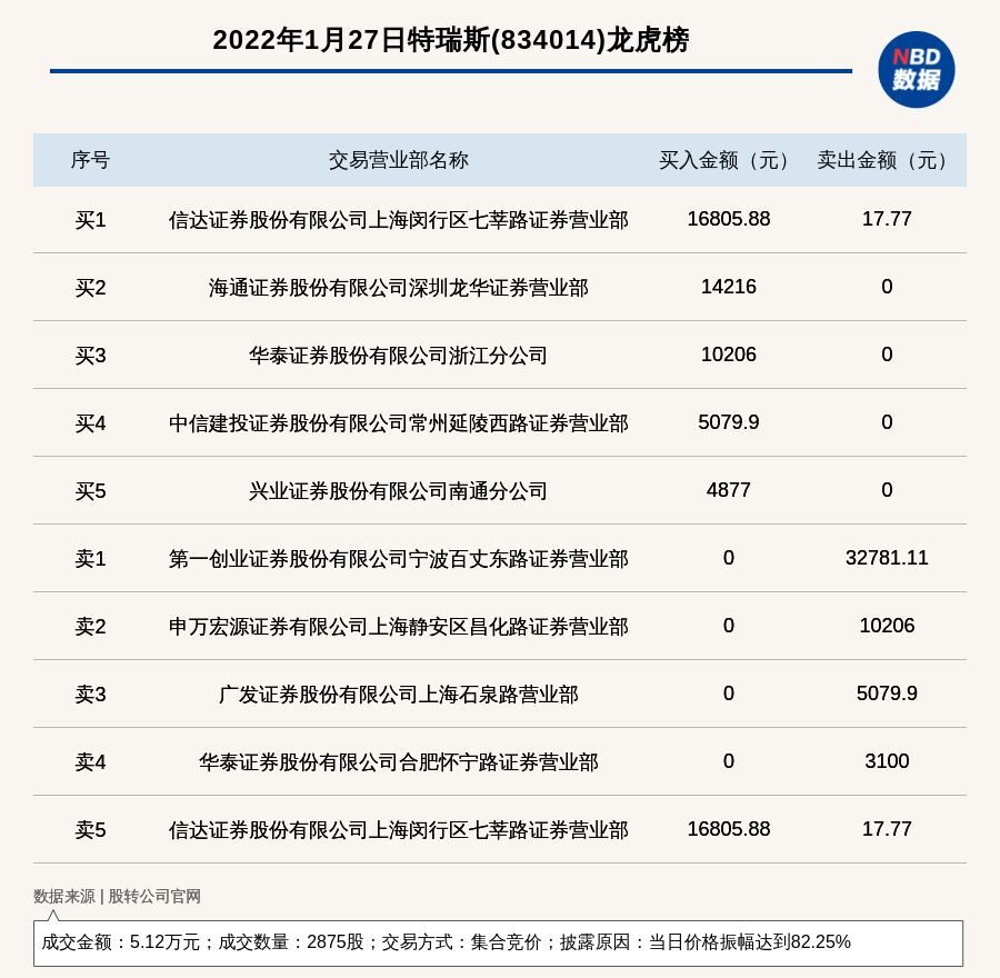 每经讯,2022年1月27日,新三板创新层公司特瑞斯(834014)登上龙虎榜,交易方式是集合竞价,披露原因是当日价格振幅达到82.25%,成交数量2875股,成交金额5.12万元。买一席位为信达证券股份有限公司上海闵行区七莘路证券营业部,买入1.68万元;卖一席位为第一创业证券股份有限公司宁波百丈东路证券营业部,卖出3.28万元。