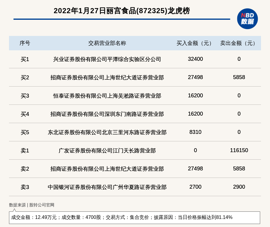 每经讯,2022年1月27日,新三板创新层公司丽宫食品(872325)登上龙虎榜,交易方式是集合竞价,披露原因是当日价格振幅达到81.14%,成交数量4700股,成交金额12.49万元。买一席位为兴业证券股份有限公司平潭综合实验区分公司,买入3.24万元;卖一席位为广发证券股份有限公司江门天长路营业部,卖出11.62万元。