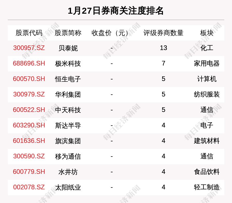 从券商对个股的关注程度来看,有25只个股获得多家券商关注,券商关注数量排名居前的个股是贝泰妮(300957.SZ)、极米科技(688696.SH)、恒生电子(600570.SH)。