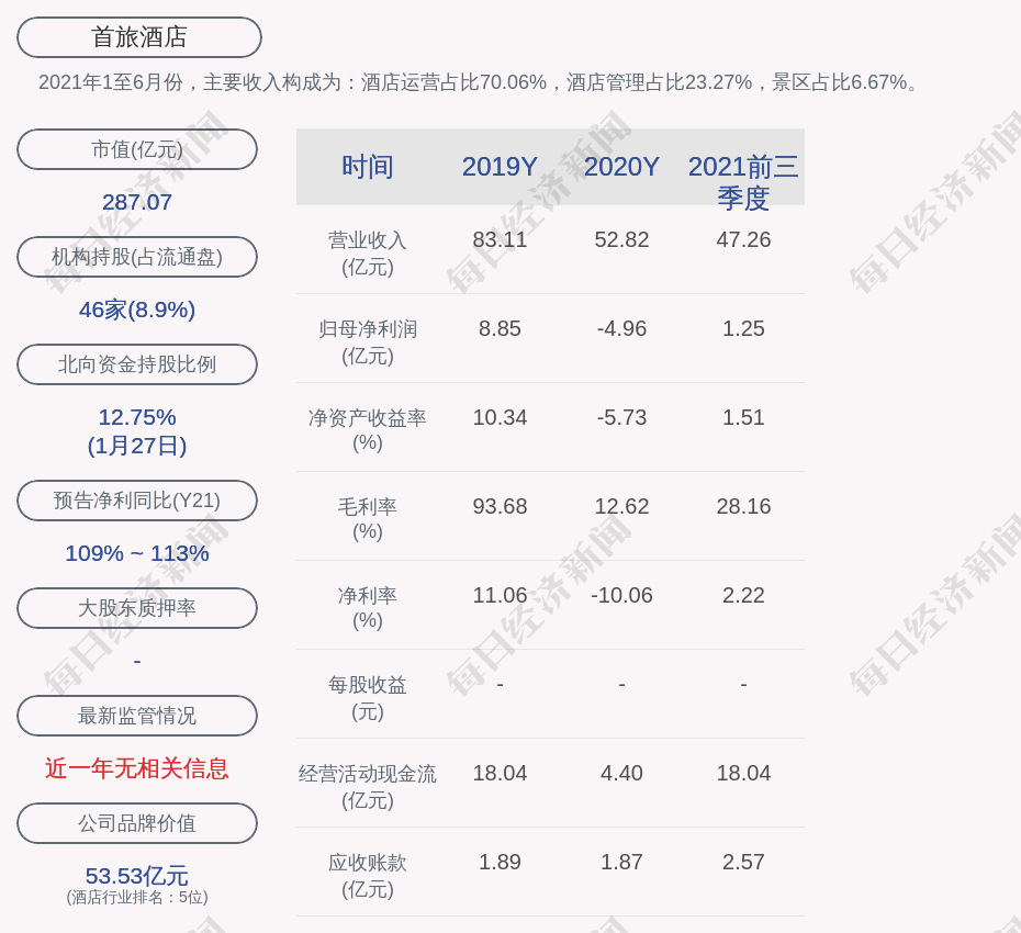 2021年1至6月份,首旅酒店的主要收入构成为:酒店运营占比70.06%,酒店管理占比23.27%,景区占比6.67%。