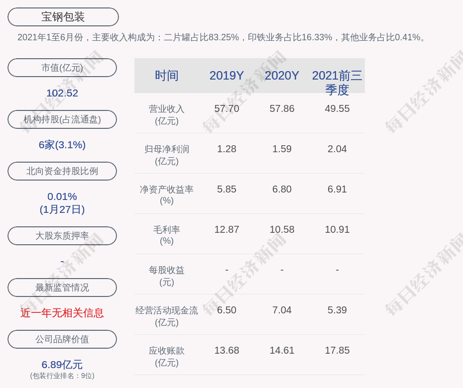 2021年1至6月份,宝钢包装的主要收入构成为:二片罐占比83.25%,印铁业务占比16.33%,其他业务占比0.41%。