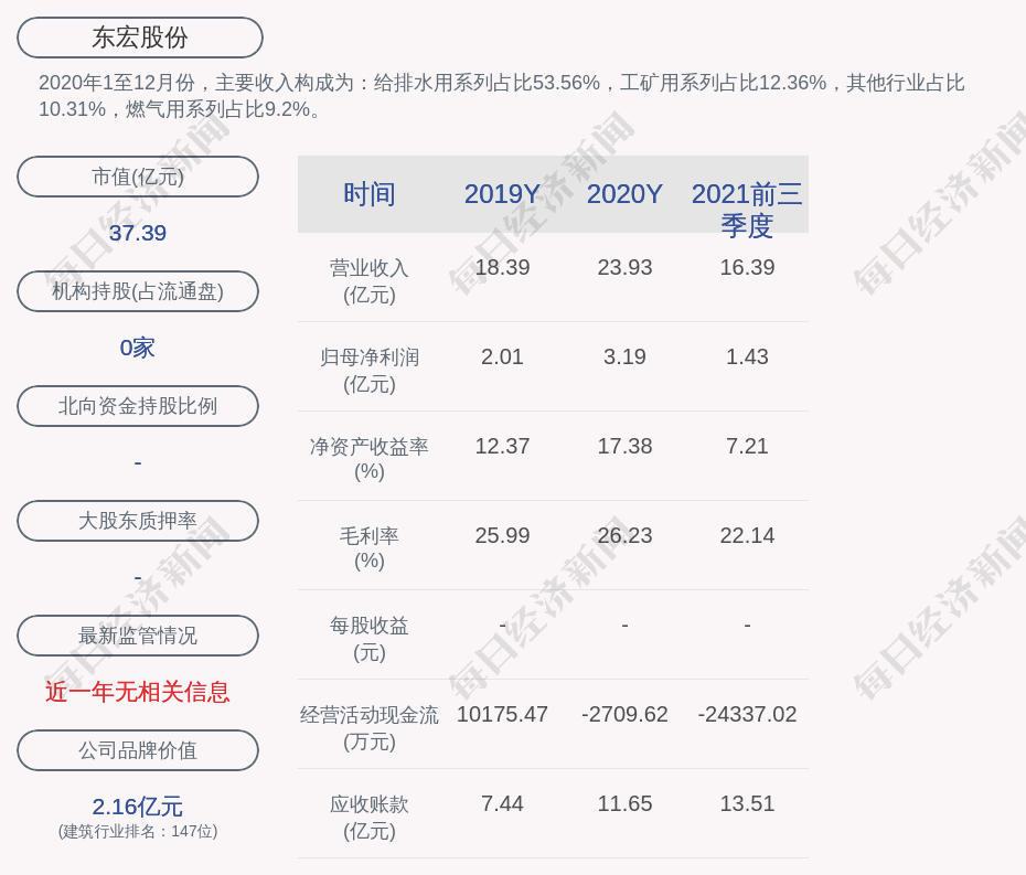 2020年1至12月份,东宏股份的主要收入构成为:给排水用系列占比53.56%,工矿用系列占比12.36%,其他行业占比10.31%,燃气用系列占比9.2%。