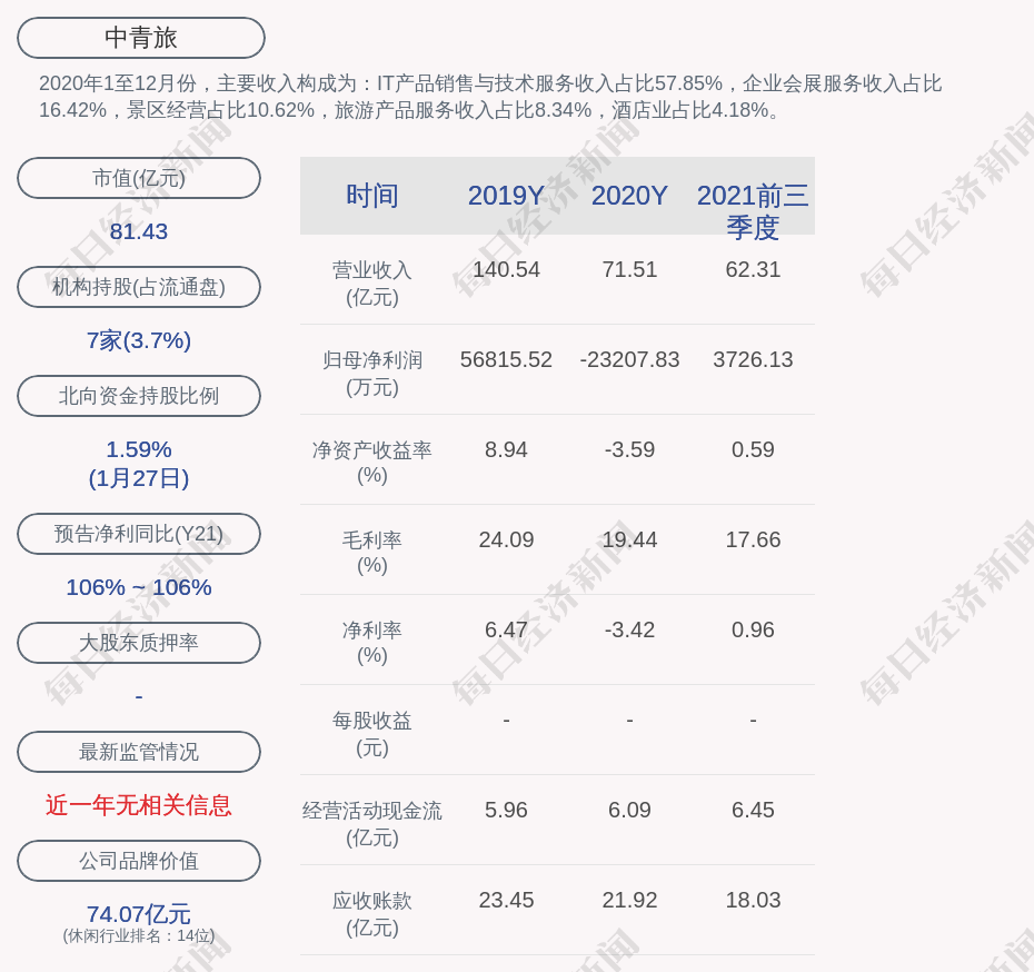 3. 根据各大券商对中青旅净利润的预测,中青旅2021年年度预测净利润平均值为1.62亿元。中青旅去年同期净利润为-2.32亿元。
