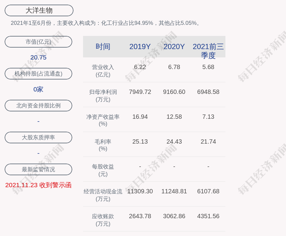 2021年1至6月份,大洋生物的主要收入构成为:化工行业占比94.95%,其他占比5.05%。