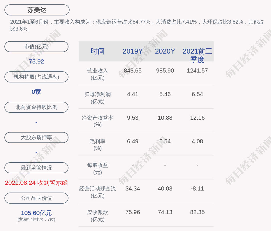 2021年1至6月份,苏美达的主要收入构成为:供应链运营占比84.77%,大消费占比7.41%,大环保占比3.82%,其他占比3.6%。