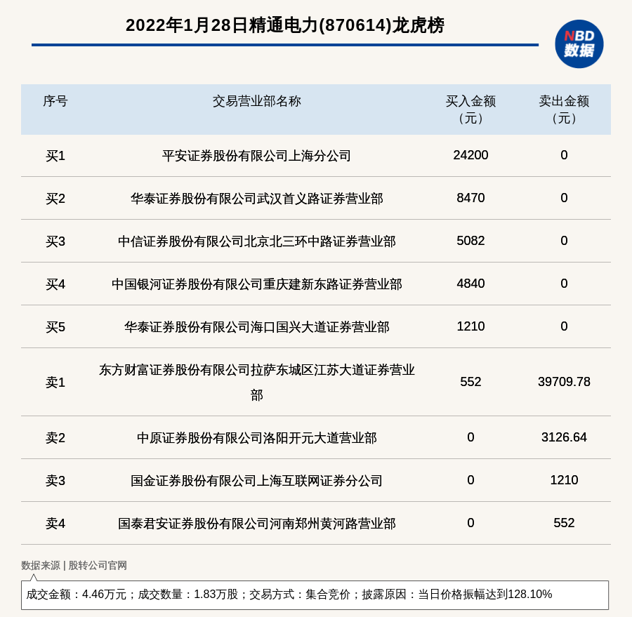每经讯,2022年1月28日,新三板创新层公司精通电力(870614)登上龙虎榜,交易方式是集合竞价,披露原因是当日价格振幅达到128.10%,成交数量1.83万股,成交金额4.46万元。买一席位为平安证券股份有限公司上海分公司,买入2.42万元;卖一席位为东方财富证券股份有限公司拉萨东城区江苏大道证券营业部,卖出3.97万元。