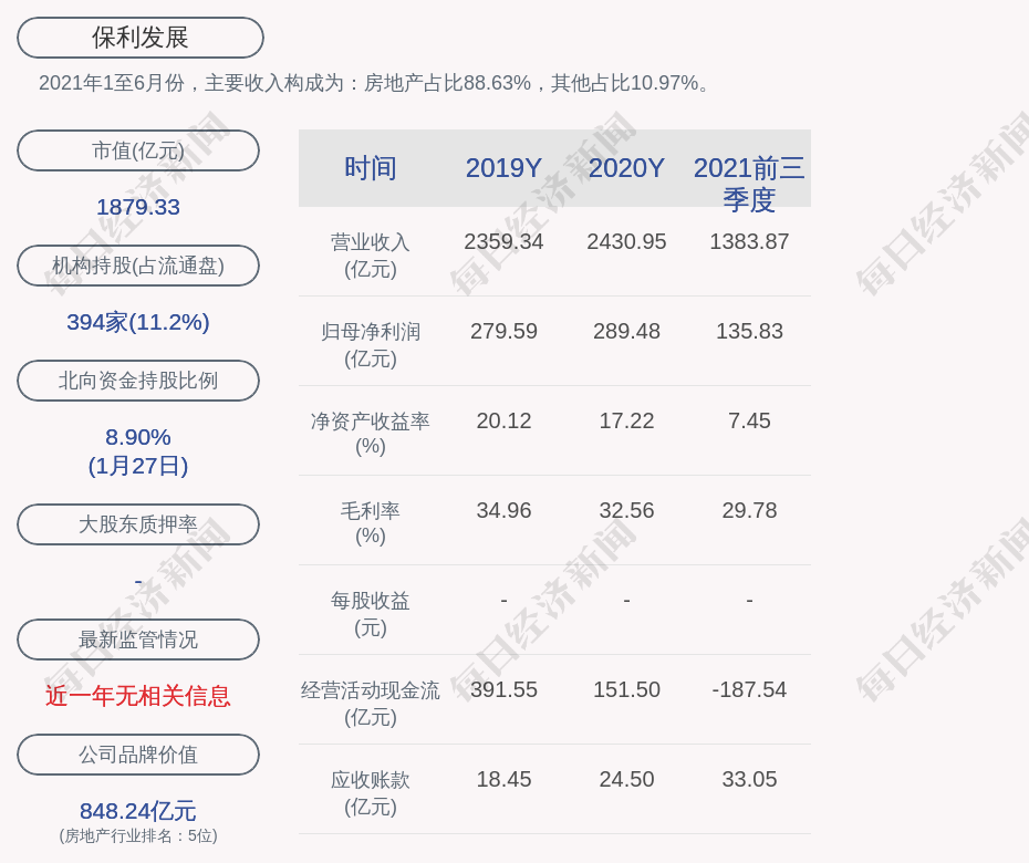 2021年1至6月份,保利发展的主要收入构成为:房地产占比88.63%,其他占比10.97%。