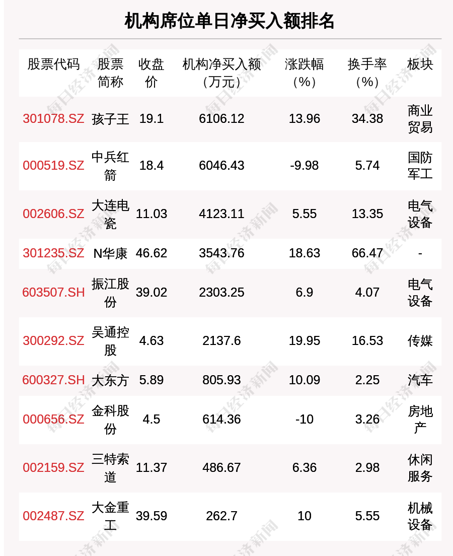 在龙虎榜中,涉及机构专用席位的个股有19只,净买入额前三的是孩子王、中兵红箭、大连电瓷,分别为6106.12万元、6046.43万元、4123.11万元。