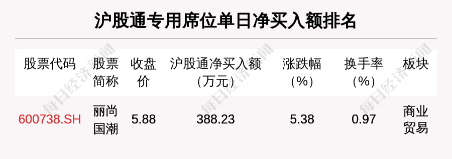 在龙虎榜中,涉及沪股通专用席位的个股有1只,丽尚国潮的沪股通专用席位净买入额最大,净买入388.23万元。