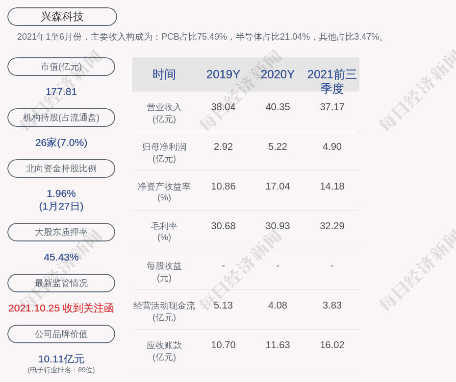 2021年1至6月份,兴森科技的主要收入构成为:PCB占比75.49%,半导体占比21.04%,其他占比3.47%。