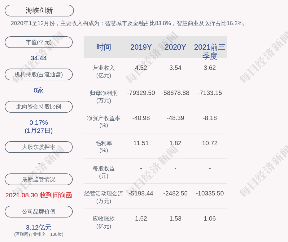 2020年1至12月份,海峡创新的主要收入构成为:智慧城市及金融占比83.8%,智慧商业及医疗占比16.2%。