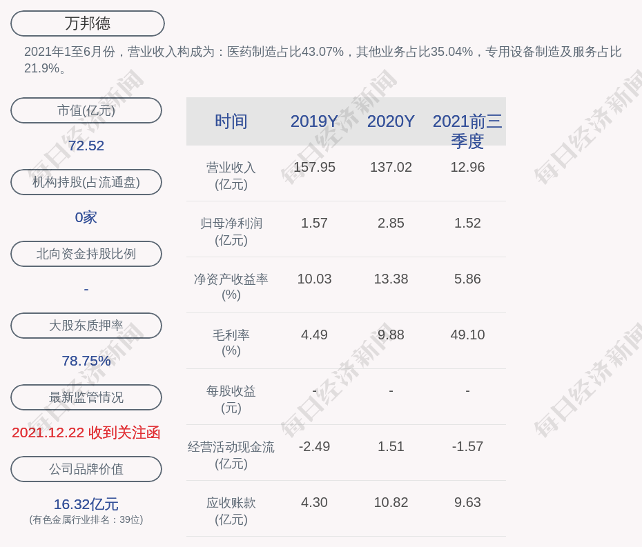 2021年1至6月份,万邦德的营业收入构成为:医药制造占比43.07%,其他业务占比35.04%,专用设备制造及服务占比21.9%。